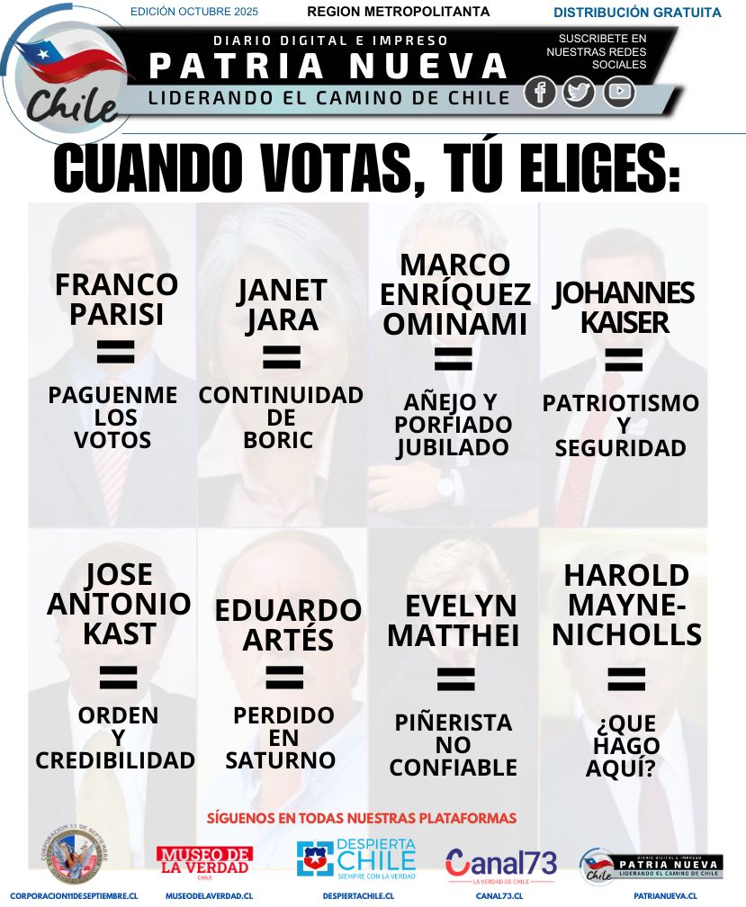 Faltando tres semanas para la primera vuelta de la elección presidencial, escribo esta columna, pretendiendo orientar a mis lectores, ya que es muy importante para nuestro querido Chile lo que está en juego en esta democracia que ha sido la desgracia para un país como el nuestro que estaba catalogado como los “jaguares de América”, con índices de crecimiento, de cesantía, que no han logrado homologar los políticos. Los invito a leer una encuesta recientemente publicada, que confirma otra consulta que entrega un 48% de apoyo al presidente Augusto Pinochet Ugarte: Pinochet se ubica en el segundo lugar de las figuras históricas más admiradas en Chile, según Cadem